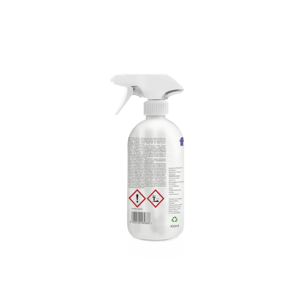 Βιοκτόνο προϊόν. Εγκεκριμένο από το Υπουργείο Αγροτικής Ανάπυξης και Τροφίμων. Aρ. Άδειας: ΤΠ19-0158, Εγγυημένη Σύνθεση: Geraniol 0,5% β/β, Pyrethrins 0,1% β/β, Boηθητικές ουσίες: 99,28% β/β.