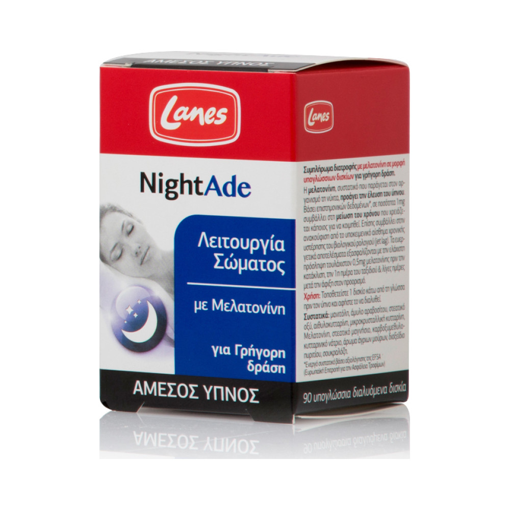 Το NightAde είναι ένα συμπλήρωμα διατροφής με μελατονίνη που βοηθάει στο φυσικό ύπνο και τη γρήγορη & άμεση μετάβαση σε αυτόν. Σε ένα μόνο δισκίο παρέχει την απαιτούμενη ποσότητα μελατονίνης (1mg) που έχει αποδειχθεί ότι συμβάλλει στη μείωση του χρόνου που χρειάζεται κάποιος για να κοιμηθεί ενώ χάρη στην καινοτομική μορφή του σε υπογλώσσια δισκία που διαλύονται γρήγορα έχει άμεση δράση με αποτέλεσμα την κορύφωση των επιπέδων της ουσίας στον οργανισμό.