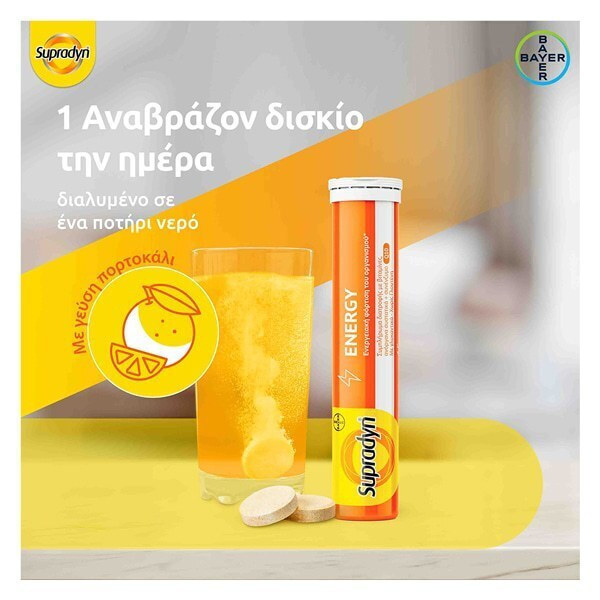 Τα αναβράζοντα δισκία Supradyn Energy προσφέρουν ενίσχυση της ενέργειας και καταπολέμηση της κόπωσης. Περιέχουν μια ισχυρή σύνθεση βιταμινών και ανόργανων συστατικών που βοηθούν στη βελτίωση της σωματικής και πνευματικής ενέργειας, ενισχύοντας την αντοχή και την ευημερία σε καθημερινές δραστηριότητες.