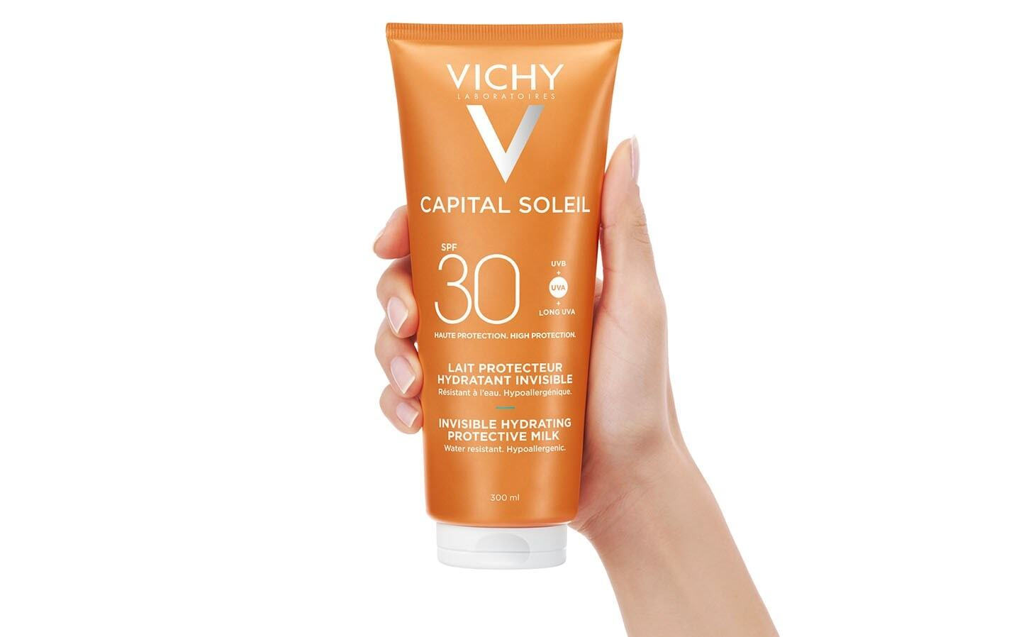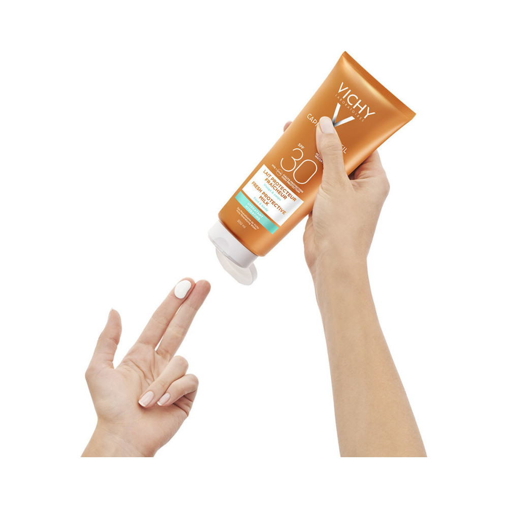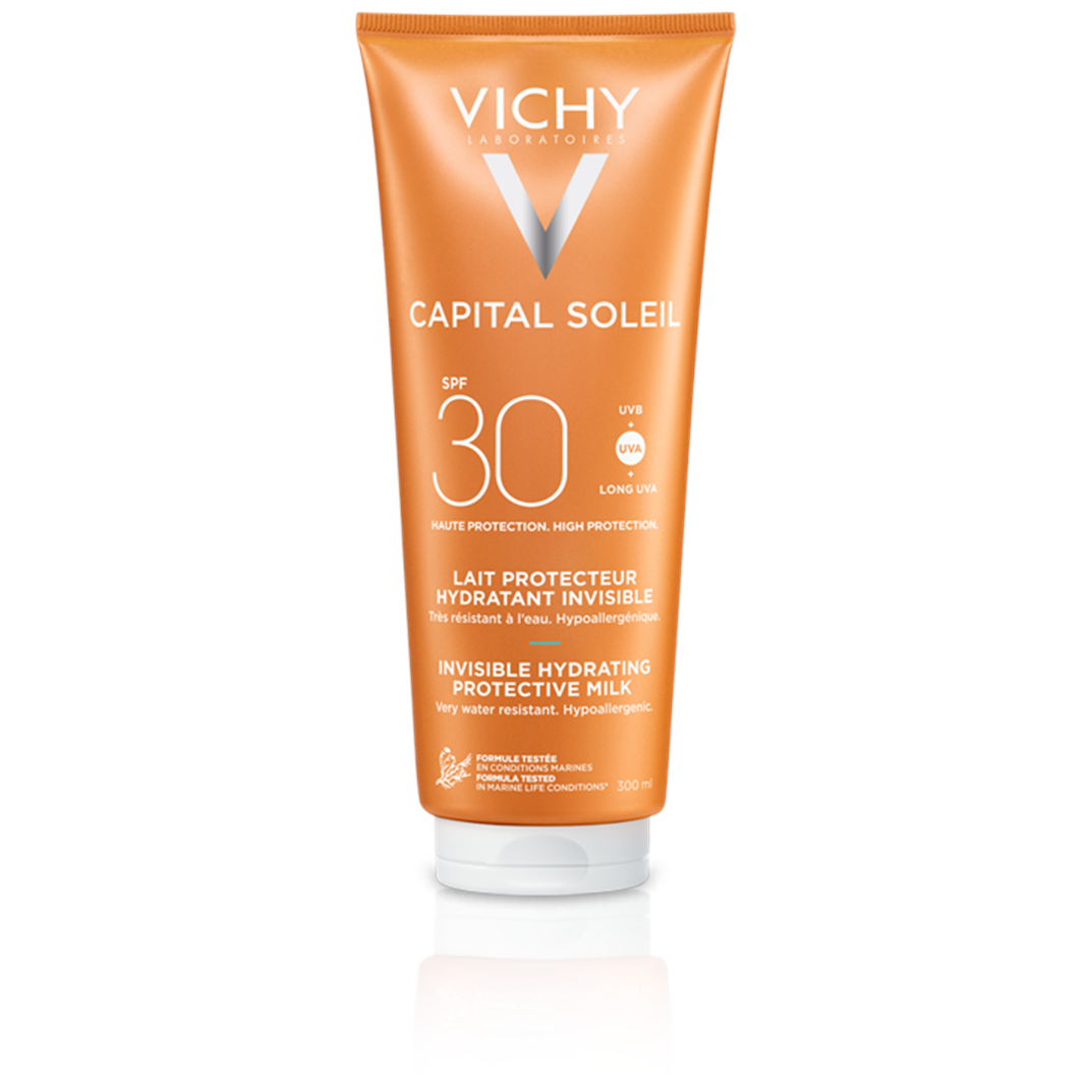 Ενυδατικό αντηλιακό γαλάκτωμα Capital Soleil Beach Protect με SPF30, που προστατεύει από τις βλάβες του ηλίου και ενυδατώνει την επιδερμίδα.