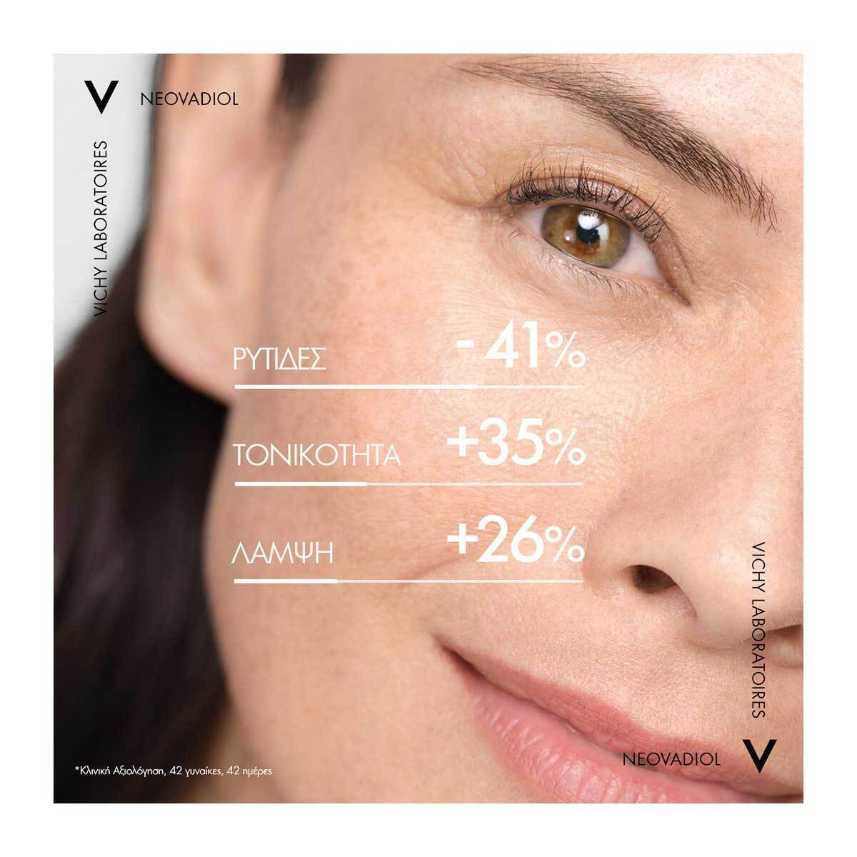 Η Vichy Neovadiol Αναπλαστική Κρέμα Προσώπου Ημέρας με SPF50 είναι ειδικά σχεδιασμένη για γυναίκες στην εμμηνόπαυση. Η κρέμα προσφέρει πολλαπλά οφέλη, συμπεριλαμβανομένων της σύσφιξης του δέρματος, της μείωσης των ρυτίδων και των κηλίδων, καθώς και της προστασίας από τις UV ακτίνες με το υψηλό SPF50. Ο συνδυασμός αυτών των συστατικών βοηθά στη βελτίωση της υφής και της ελαστικότητας της επιδερμίδας, προσφέροντας μια πιο νεανική και ομοιόμορφη εμφάνιση.